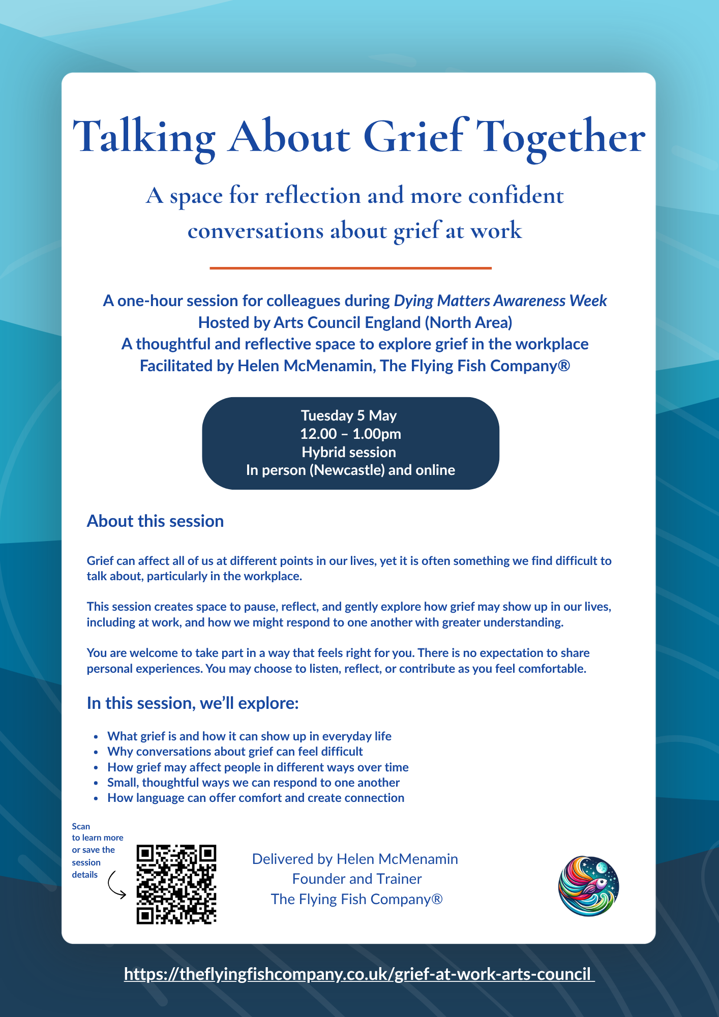 I’m Helen, founder of The Flying Fish Company®. My work is shaped by both lived experience and professional insight, supporting organisations to respond to grief with greater clarity, compassion and confidence.